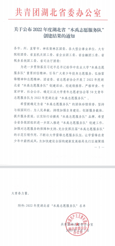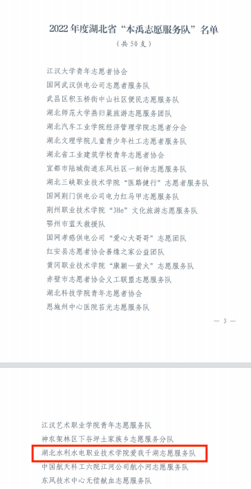 近日,beat365官网“爱我千湖”志愿服务队被团省委正式确定为2022年度湖北省“本禹志愿服务队”。通过上级部门严格审查和评审,从百余名创建集体中遴选出50支队伍,其中高职院校队伍仅有6支最终创建成功。