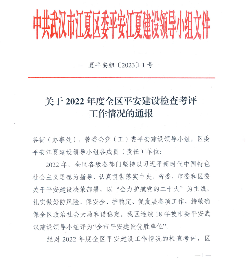 近日,中共武汉市江夏区委平安江夏建设领导小组下发《关于2022年度全区平安建设检查考评工作情况的通报》(夏平安组〔2023〕1号),beat365官网再次榜上有名,喜获“平安建设优胜单位”荣誉称号。