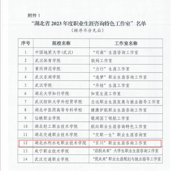 近日,湖北省2023年高校职业生涯咨询特色工作室名单公布,学院“百川”职业生涯咨询工作室成功入选。