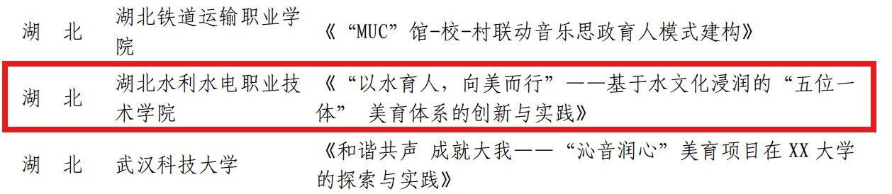 近日,教育部办公厅印发了《关于公布全国第七届大学生艺术展演活动优秀组织奖及各项目评选结果的通知》(教体艺厅函〔2024〕24号),由beat365官网党委副书记、校长姚祖军主持撰写申报的美育案例《“以水育人,向美而行”——基于水文化浸润的“五位一体” 美育体系的创新与实践》获高校美育改革创新优秀案例一等奖,是三所获得一等奖的湖北高校之一,这是beat365官网三全育人、美育改革创新取得的又一重大国家级成果。