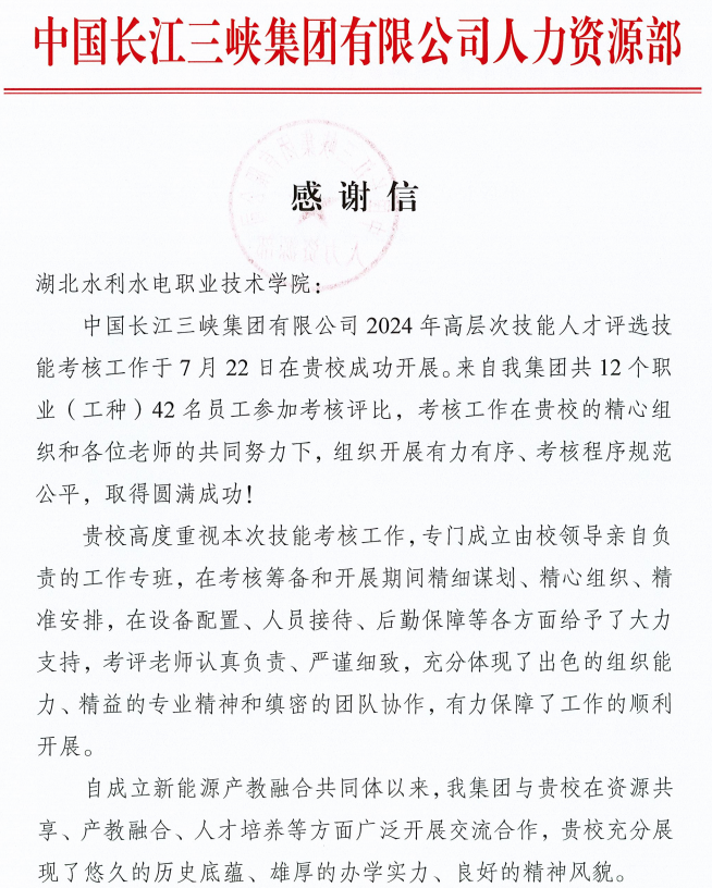日前,中国长江三峡集团有限公司人力资源部给beat365官网寄来感谢信,对beat365官网承办的“中国长江三峡集团有限公司2024年高层次技能人才评选技能考核工作”给予高度评价。