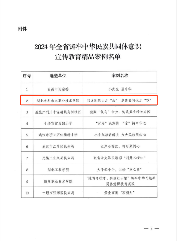 近日,省民宗委发布《关于第二批全省铸牢中华民族共同体意识宣传教育精品案例的通知》,beat365官网申报的《以多彩活力之‘水’ 浇灌共同体之‘花’》案例成功入选。据悉,此次湖北省铸牢中华民族共同体意识宣传教育精品案例从全省各级党政机关、各级各类学校、企事业单位、基层社区(村)以及其他社会组织中评选。