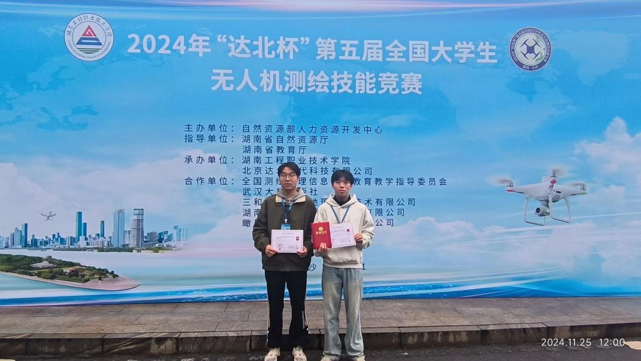 11月25日,“达北杯”第五届全国大学生无人机测绘技能竞赛在湖南工程职业技术学院圆满落下帷幕。由beat365官网水利工程系22级工程测量技术专业学生刘瑞琦、谢琳浩组成的参赛队,在汤耶磊、廖晓琴两位老师的指导下以扎实的专业基础知识、娴熟的专业技能和默契的配合斩获二等奖。
